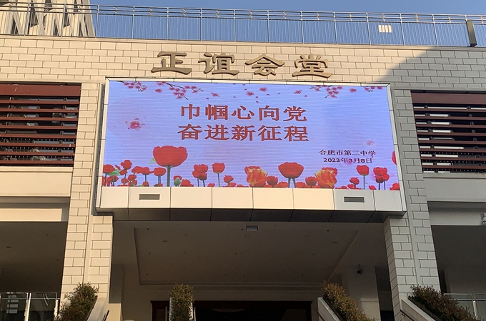 该屏正对学校大门,位于学校中轴线上,采用16:9宽屏设计,总计33平方米,整体画面色彩均匀,真实自然,视觉效果极佳!配合“君尧楼”现代化建筑格调,通过先进的多媒体显示和互动技术彰显校园特色和文化内涵。学校科信处高度重视智慧屏内容的征集,每周都会更新展示内容。主要用于发布学校重要信息、校风校训标语、荣誉表彰、安全知识宣传、重大活动视频、图文等。这块屏已经成为校园宣传和教育展示的主要阵地,也是学校一张富有内涵的文化名片!