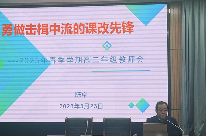会议第二项,陈卓副校长作“勇做击楫中流的课改先锋”主题讲话。陈校长从“新高考模式的数据分析说明”“新高考带来的新挑战”“工作建议和要求”等三个部分展开论述,结合详实数据分析,向高二全体教师展现了新高考下呈现的新动态,为新高考下的高二教学指明了努力方向。
