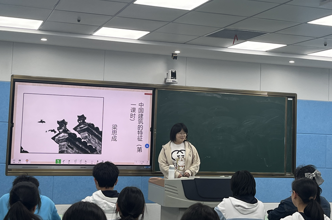 张欣荣老师执教的篇目是《中国建筑的特征》,她以“美”为主线,从“发现美,探究美,说明美,创造美”四个角度带领同学们开启了一段探寻中国建筑之美的旅程。教学中紧扣文体特点,带领学生抓关键词句分析文本,梳理文脉,层层递进,循循善诱。同时精心选取身边的建筑激发学生兴趣,调动学生课堂的积极性,课堂氛围轻松愉悦,师生互动良好。