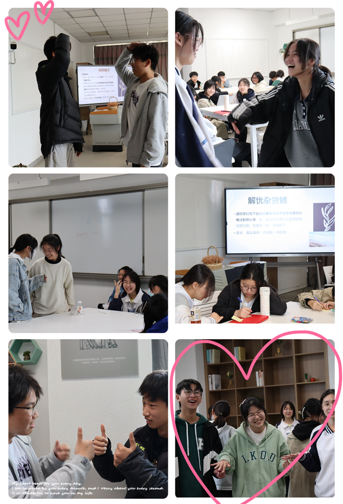 此次团体辅导系列活动,给同学们营造了一种“健康生活、快乐生活”的氛围,同学们在交流中收获,在体验中成长,进一步加强了同学间团结友爱、互帮互助、携手共进的集体意识,培育了个人自尊自信、理性平和、积极向上的健康心态,也学到了如何发泄情绪的方法,释放压力,调节心理平衡。希望同学们把这些收获运用到学习和生活中,从容应对挫折与挑战,以更饱满的精神和更阳光的心态迎接学习和生活!