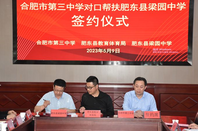 2023年5月9日下午,合肥市第三中学与肥东县梁园中学举行结对帮扶签约仪式,缔结友好合作关系。肥东县教体局领导以及两所学校的领导班子等20余人参加了此次签约仪式,梁园中学党支部书记音邦明主持了此次签约仪式。