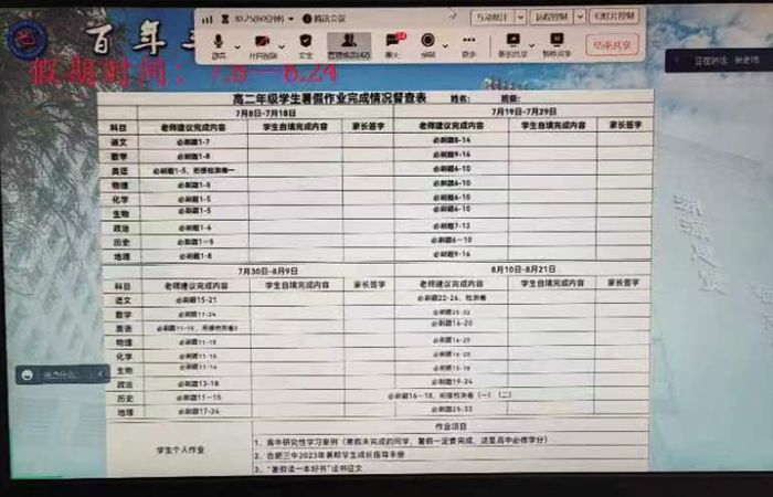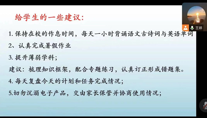 其次班主任给家长们提出了暑假期间学生居家学习的安排建议,要求同学们要制定好假期学习计划,要抓住时机进一步夯实基础同时补足薄弱学科的短板,为即将到来的高三冲刺做好准备。班主任同时希望所有家长都要树立高三意识,积极营造良好和谐的家庭环境,劳逸结合,帮助学生高效合理地安排假期的生活和学习。班主任指出,虽在假期但家校沟通不能中断,老师将通过不同途径开展家访等家校共育活动,共同呵护孩子们的假期成长。