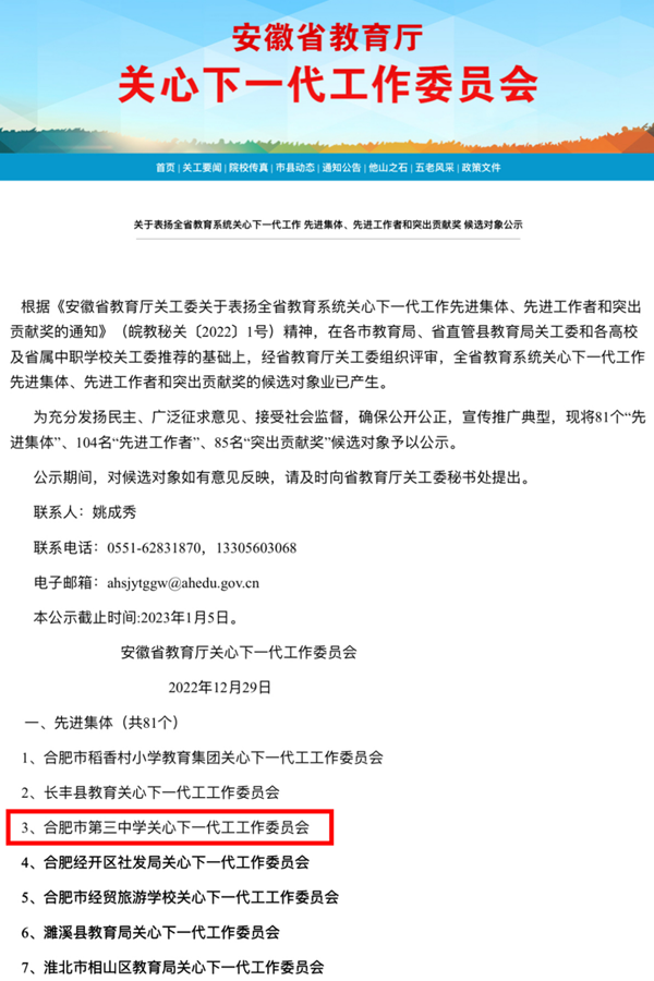 近日,安徽省教育厅关心下一代工作委员会表彰了全省教育系统关心下一代工作先进集体、先进工作者和突出贡献奖,合肥市第三中学关心下一代工作委员会荣获安徽省教育系统关心下一代工作“先进集体”称号。
