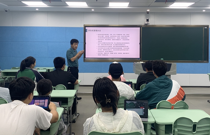 王文忠主任首先向同学介绍学生平板的管理办法,包括平板使用规范,平板日常维护方法和使用注意事项,针对学生平板损坏、丢失的处理办法,也作详细解读。学生平板是用来帮助学生学习的工具,不得游戏等其他活动。