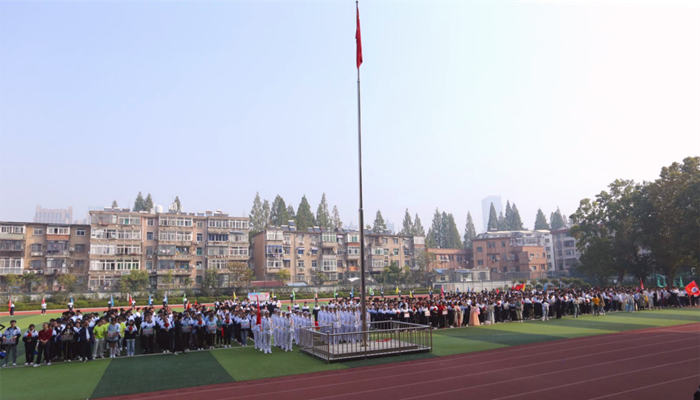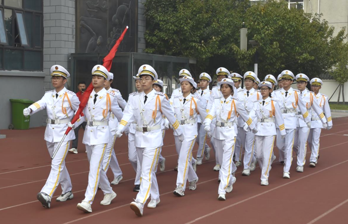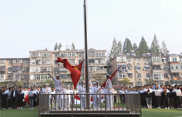 国旗护卫队眼神坚定,步履铿锵,护送国旗入场。一抹鲜艳的中国红缓缓而来,护旗手昂首阔步,英姿飒爽,高举信仰,带着“溯源思贤,励志笃学”的三中精神逐梦前行。