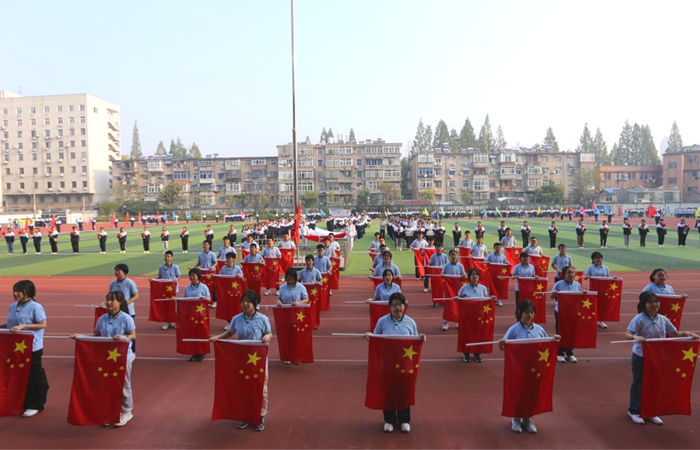 鲜艳的五星红旗,在雄壮的旋律中冉冉升起,全体师生齐唱国歌行注目礼。风卷旗舒,飘扬的五星红旗激荡着峪宏人的无限豪情。