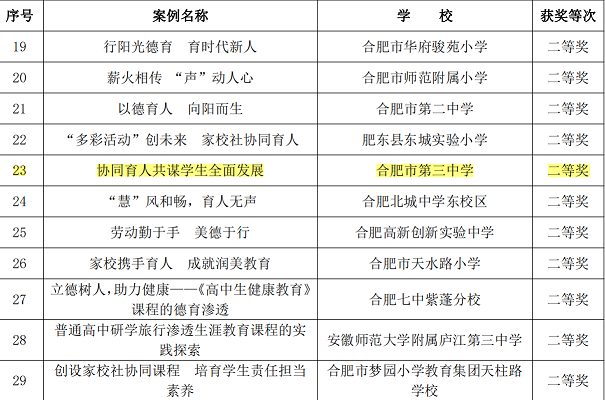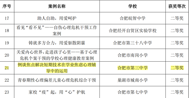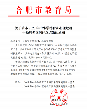 近日,合肥市教育局发布了《关于公布2023年中小学德育和心理危机干预典型案例评选结果的通知》,我校周齐老师的《协同育人共谋学生全面发展》获中小学德育工作典型案例二等奖,董小妹老师的《例谈焦点解决短期技术在学业焦虑心理辅导中的运用》获中小学心理危机干预典型案例二等奖。这也标志着学校的心理健康教育工作上了一个新的台阶!