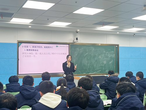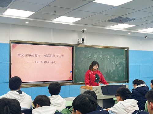 首先执教的是张欣荣老师,她以《咬文嚼字品其人,溯源思贤悟其志》为主题,重点引领同学们通过梳理屈原的人生经历、分析不同人物对屈原的影响,体会屈原的人生选择。张老师的课堂目标明确,教态自然大方,活动形式新颖,趣味性强,锻炼了学生的批判性思维和解决问题的能力。