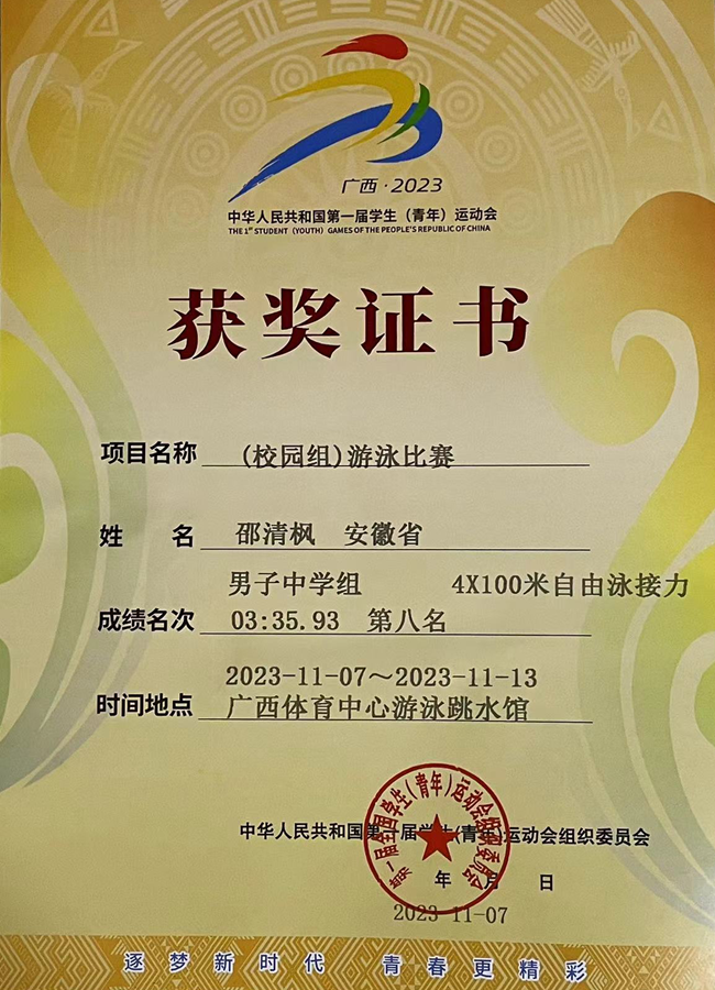 在专业发展上,他顽强拼搏、刻苦训练,从不放弃每一次的进步机会,不断突破自我,现已达标100米、200米、400米、自由泳等多项国家一级运动员标准。曾在安徽省锦标赛和安徽省冠军赛上获得多次冠亚季军;2022年安徽省锦标赛中被评为体育道德风尚奖;在安徽省第十四届省运会上斩获两金一银并打破一项赛会纪录;参加国家级赛事斩获前三、前八名若干;第二届青年运动会上获得第12名。在2023年结束的全国第一届学生青年运动会上,他与队友一起代表安徽省出战,参加中学组男子4X100米自由泳比赛,获得全国第八的优异成绩,打破了安徽省保持6年的青年组纪录,同时也刷新了安徽省尘封了12年之久的历史最高成绩,成为安徽省该项目新的记录保持者。