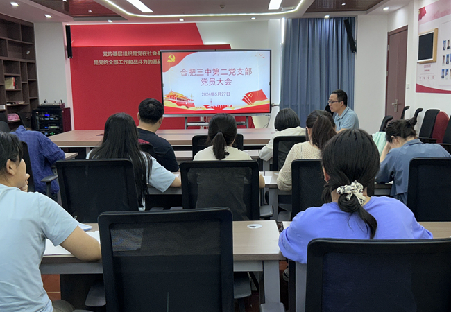 2024年5月27日下午,合肥市第三中学第二党支部在君尧楼七楼党建活动中心召开党员大会。此次会议由党支部书记蒋自路主持,全体党员参会。