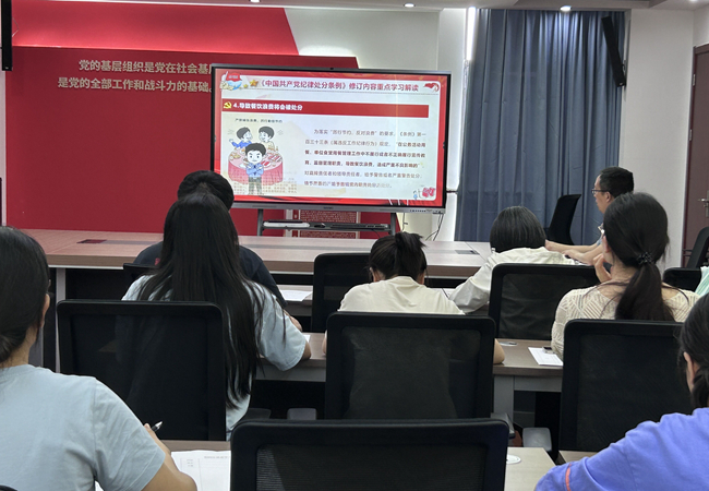 党支部书记蒋自路给党员同志上了一节生动的党课:《中国共产党纪律处分条例》修订内容重点学习解读。党员教师要把学习贯彻《条例》作为重要政治任务,以严明的纪律推进党的自我革命,不断提升自身的政治素养和拒腐防变能力,使廉洁自律规范内化于心、外化于行,守住纪律“底线”、不越“红线”,切实以学纪、知纪、明纪、守纪的优良纪律作风促进教育教学工作高质量发展。