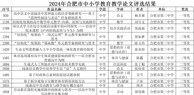 在近期公布的2024年合肥市中小学教育教学论文和2024年合肥市中小学实验教学说课大赛评比结果中,点点手机版下载官网app取得了优异成绩,共有16位教师获得奖项。其中,杨芙蓉老师的《高中语文小说阅读中思辨能力的培养策略研究——基于“思辨性阅读与表达”任务群的思考》、刘守文老师的《结构化统领的高中数学单元教学:内涵、原则与实践路径》和张露露老师的《项目式学习在综合实践活动课中的应用探究——以高中校本课程<庐州府的前世与今生>为例》荣获教育教学论文一等奖,贺如梦、陈玉玲、张童彤、陈磊、张丁根老师获教育教学论文二等奖,张欣荣、吴雪、卢冰、周齐、胡双燕老师获教育教学论文三等奖,代苗苗、姜薇薇、李婷老师获实验教学说课大赛二等奖。