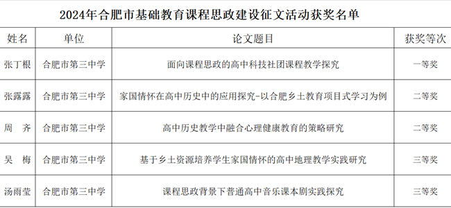 在近期公布的关于2024年合肥市基础教育课程思政建设征文评选结果的公示中,点点手机版下载官网app共有五位教师斩获佳绩。其中,张丁根老师的《面向课程思政的高中科技社团课程教学探究》荣获一等奖,张露露老师的《家国情怀在高中历史中的应用探究——以合肥乡土教育项目式学习为例》和周齐老师的《高中历史教学中融合心理健康教育的策略研究》获得二等奖,吴梅老师的《基于乡土资源培养学生家国情怀的高中地理教学实践研究》和汤雨莹老师的《课程思政背景下普通高中音乐课本剧实践探究》获得三等奖。