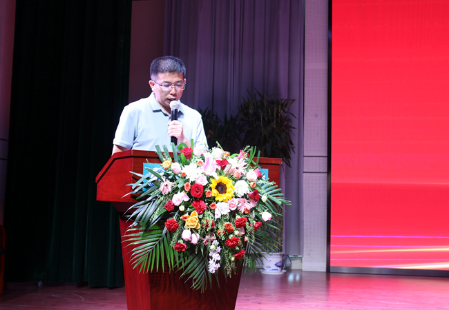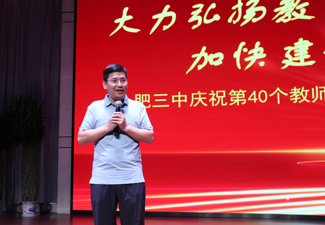 “安徽省优秀教师”刘守文作为教师代表发言。他分享了多年来的教育经验和智慧,介绍了自己如何坚持落实立德树人教育根本任务,实现个人专业成长,始终做到潜心教学、静心育人。他表示将继续不忘初心,努力奋斗,作“教育家精神”的坚定践行者。