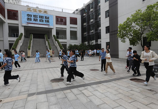 随着警报声的响起,学校党委书记马剑、校长沈龙海等校领导以及中层干部协助各班主任一起组织学生疏散。各班学生在老师们的指挥下,按照指定路线,迅速撤离到安全地点。随即各年级清点人数并整队,由各年级部主任向沈龙海校长报告实到人数以及疏散情况。
