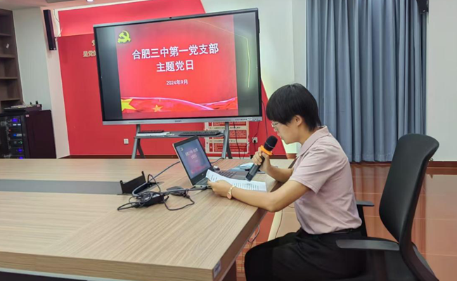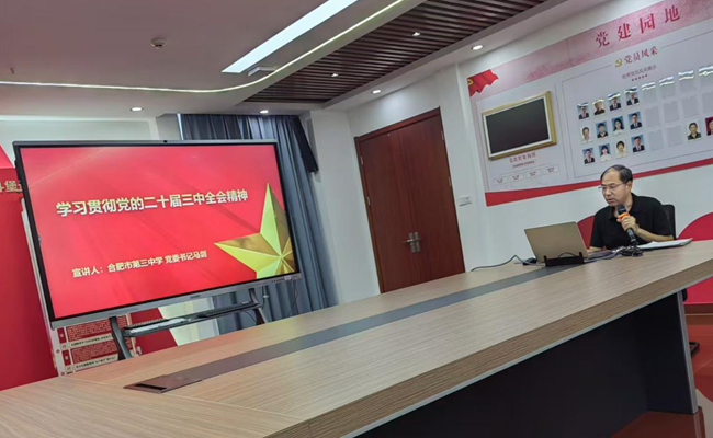 会议开始,合肥市第三中学党委书记马剑给全体党员上专题党课--学习贯彻党的二十届三中全会精神。二十届三中全会是在我们党带领人民以中国式现代化全面推进强国建设、民族复兴伟业的关键时期召开的一次极为重要的会议。这次全会的主题是,进一步全面深化改革、推进中国式现代化。最重要的成果是,审议通过了《中共中央关于进一步全面深化改革、推进中国式现代化的决定》。二十届三中全会深刻回答了新征程上实现什么样的改革,怎样全面深化改革、推进中国式现代化的重大问题。