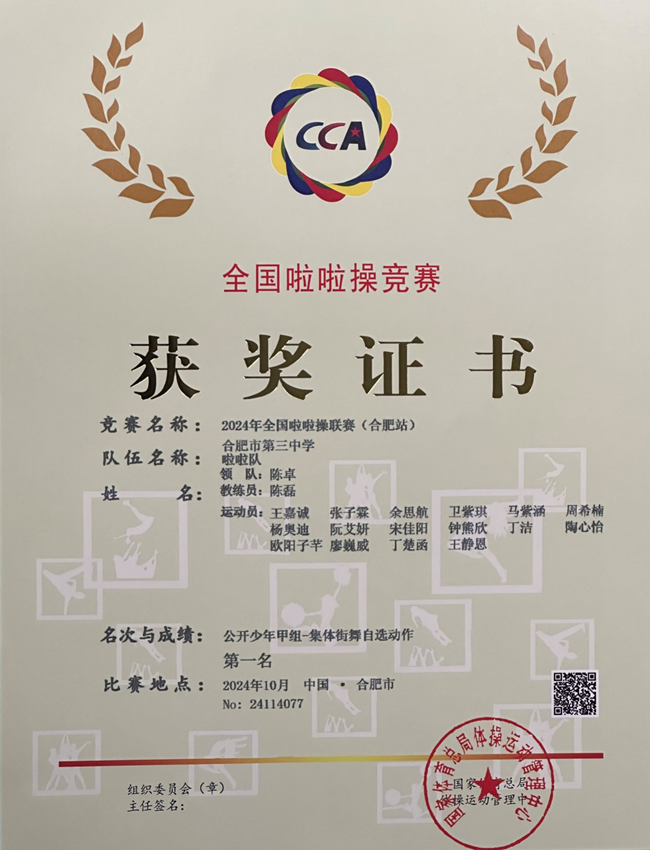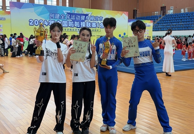 10月的一个周末,一场精彩纷呈的集体街舞比赛在万众瞩目下顺利落下帷幕,经过激烈的角逐,我们凭借出色的表现,脱颖而出,荣获本次比赛少年甲组集体街舞冠军,为这场充满活力与激情的比赛画上了我们完美的句号。从开场的震撼亮相,到中间的高难度动作展示,再到结尾的完美收官,每一个环节都令人惊叹不已,我们的动作充满了力量与美感,动作干净利落,节奏把握精准,队员之间配合仿佛心有灵犀。然而,冠军的获得并非偶然,从得知比赛通知的那一刻起,我们这群热爱街舞啦啦操的高中生们便满怀憧憬与热情地投入到了紧张的备赛之中,大家将各种酷炫的街舞元素与活力满满的啦啦操动作巧妙融合,力求打造出独一无二的表演。无数个放学后的日子里,学校的舞蹈室成为了我们的战场,汗水湿透了衣衫,疲惫侵袭着身体,但我们从未有过一次退缩,每一个动作反复打磨,每一次队形精心调整。我们的教练、指导老师陈磊老师也倾尽全力,为队员们提供专业的指导,正是这种对啦啦操的热爱与执着,让我们在比赛中绽放出耀眼的光芒。