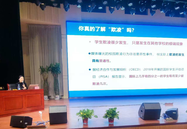 讲座伊始,朱婷婷以亲切的语气开场,紧紧围绕着“学生欺凌是什么、欺凌行为要警惕什么、怎样预防学生欺凌”等方面,深入浅出地讲解学生欺凌的概念、构成、类型、危害、法律结果等内容。朱婷婷还不时穿插着提问,引导学生步步深入,帮助同学们深刻理解何为学生欺凌、遇到学生欺凌时应当如何应对,同时告诫同学们“未成年不是违法犯罪的免死金牌”,切莫以身试法充当欺凌者或协助者。在宣讲中充分解读相关法律条文,以此达到培养和增强学生的法治意识和规范意识,让他们正确认识自我、学会共处、学会担责,形成正确的世界观、人生观、价值观。
