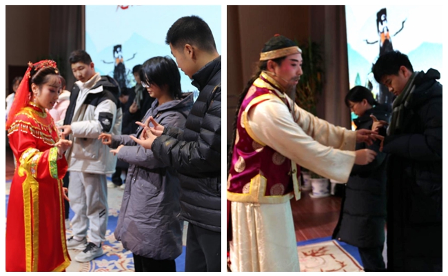 第一场表演结束后,在热烈的氛围中,学生们争先恐后地想上台学习。演员们邀请部分学生上台,耐心示范,悉心指导,兰花指轻翘,云步轻移,身姿婀娜。学生们认真模仿,眼神专注,虽动作稍显稚嫩,但一招一式皆具神韵,现场洋溢着传承戏曲文化的蓬勃生机。