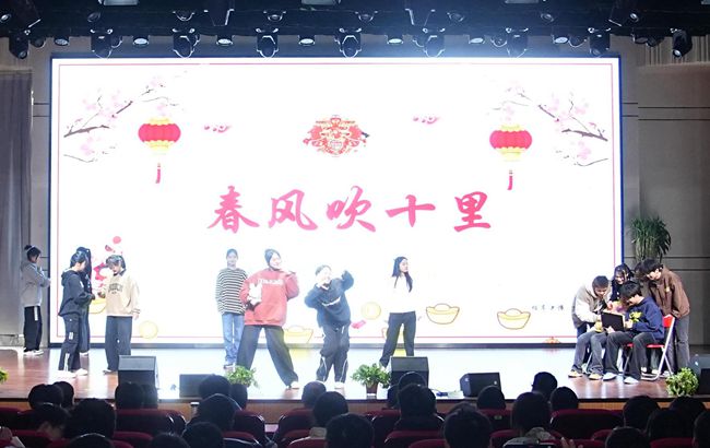 晚会以饱满的热情拉开序幕。团委副书记陈磊带领Goshawk舞蹈社的同学们带来的开场舞《春风吹十里》以欢快的音乐和热情的舞姿迅速吸引观众的注意力,会场的喜庆气氛瞬间被点燃。观众们发出阵阵欢呼,共同感受着这份喜庆的气氛。