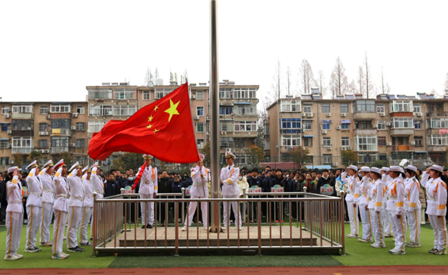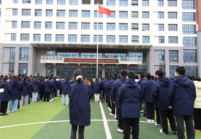 典礼伊始,国旗队迈着整齐有力的步伐,护送国旗入场。在雄壮的国歌声中,鲜艳的五星红旗冉冉升起,全体师生肃立注目,心怀敬意,共同开启新学期的奋斗征程。现场气氛庄重而热烈,展现了全体师生昂扬向上的精神风貌。