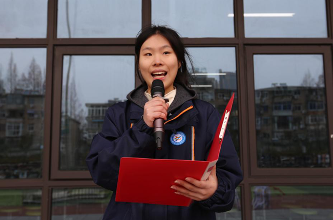学生代表高二(14)班张杨逸凡同学上台发言。她结合自身学习经历,号召同学们们树立目标并持之以恒,在新学期追光逐梦,努力前行。
