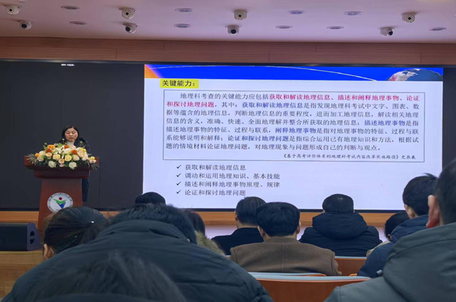 随后,合肥市第一中学的张红军老师对2025年合肥市高三第一次教学质量检测的试题进行了深入分析。张老师指出,命题设想主要基于三点:依据国家标准,科学命题,确保试题的科学性和合理性;考查主干知识,发挥模拟功能,帮助学生熟悉考试形式和内容;讲好中国故事,弘扬中国精神,增强学生的民族自豪感和文化自信。他还为老师们提供了高三考试复习的宝贵建议,包括做题习惯的培养,如注意缩写与扩写;回归教材,深入理解原理与内涵;以及培养地理素养思维,涵盖学习方式、价值观、时空视角、思维方式和能力等方面。