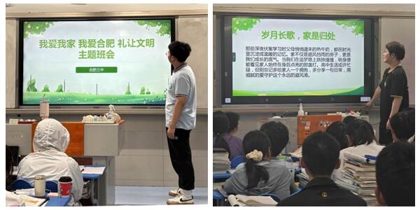 各班级积极开展“我爱我家 我爱合肥 礼让文明”主题班会。班会上,同学们踊跃发言,分享自己在家庭中践行文明礼仪的小故事,探讨如何在日常生活中做到爱护公共环境、遵守交通规则、礼让他人。主题班会的开展,让文明理念在班级中生根发芽,进一步凝聚了全体学生的文明共识。
