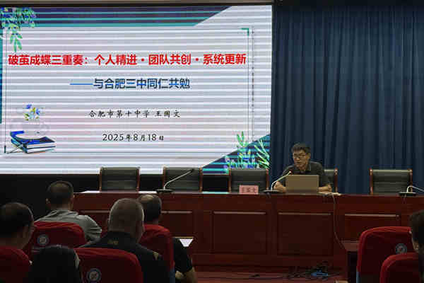 下午14时30分,安徽省十佳校园阅读推广人、合肥市阅读教育名师工作室领衔人、合肥十中阅读推广中心主任王国文带来了关于教师专业发展的讲座——《破茧成蝶三重奏:个人精进•团队共创•系统更新》。王主任首先带领大家共读《高效能人士的七个习惯》,通过对书中经典内容的解读,引导教师们思考如何在个人成长中运用这些习惯。随后,他结合班主任成长闭环,分享了《高效能人士的七个习惯》的读书心得,强调了个人筑基、团队协同和系统更新在班主任工作中的重要性。最后,王主任提出“方向比努力更重要”的观点,为青年教师成长提供了“导航思维”,让教师们对自身的专业发展路径有了更清晰的规划。